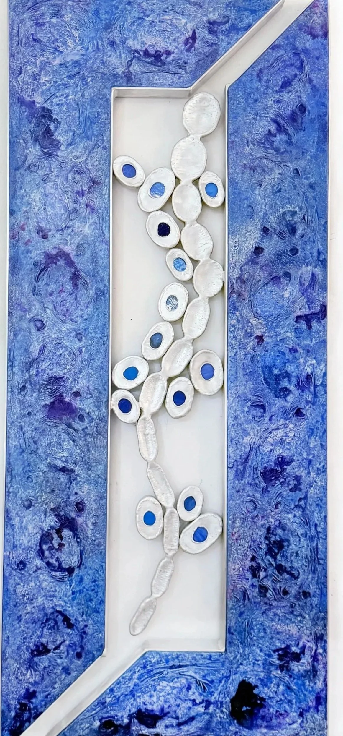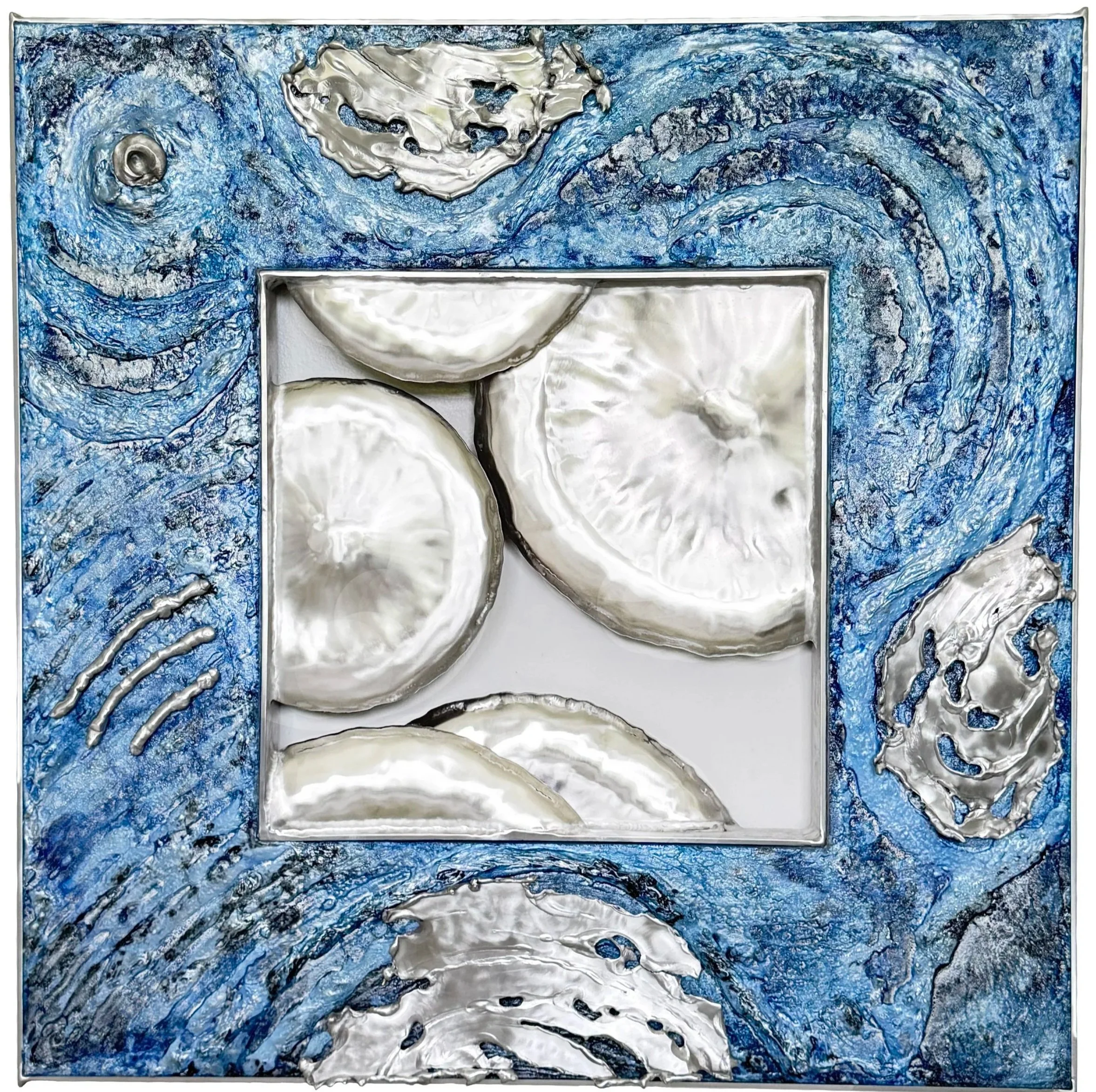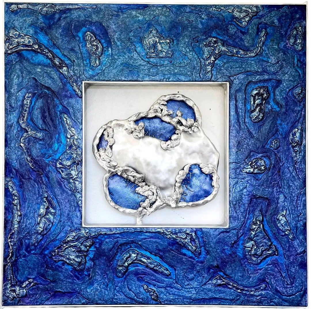 Materials: Acrylic on canvas with an aluminum and acrylic sculpture inset. Brushed aluminum frame.