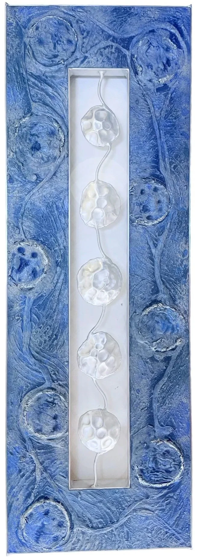 Materials: Acrylic on canvas with an aluminum and acrylic sculpture inset. Brushed aluminum frame. $7,500-SOLD
