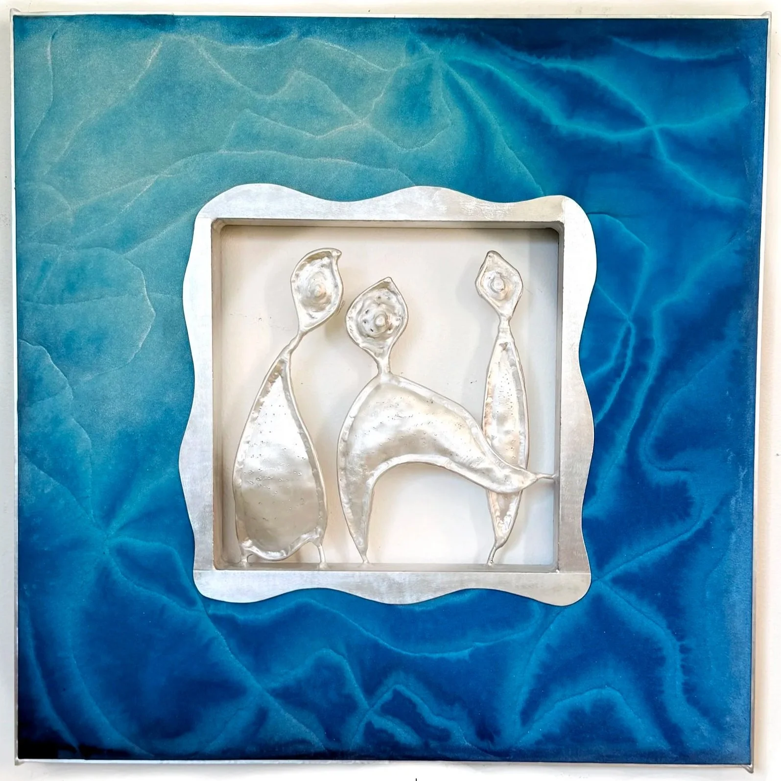 Materials: Acrylic on canvas with an aluminum sculpture inset. Brushed aluminum frame.
