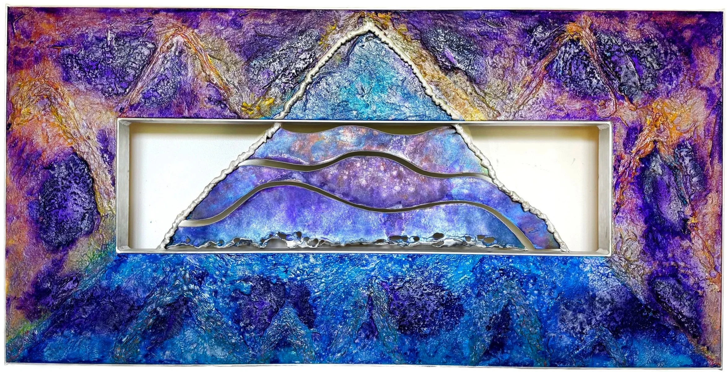 Materials: Acrylic on canvas with an aluminum, copper, acrylic sculpture inset. Brushed aluminum frame.