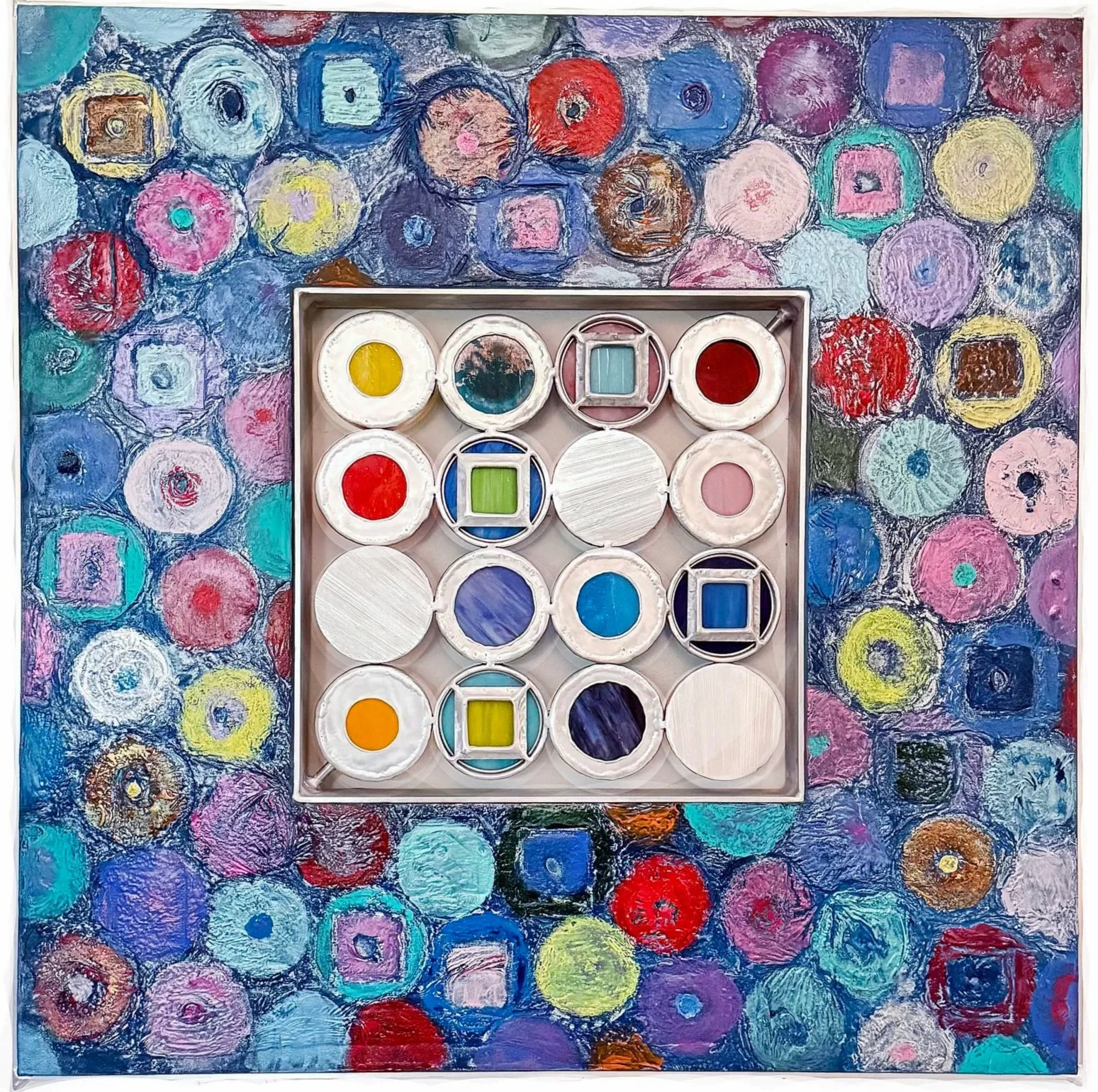 Materials: Acrylic on canvas with an aluminum and glass sculpture inset. Brushed aluminum frame.