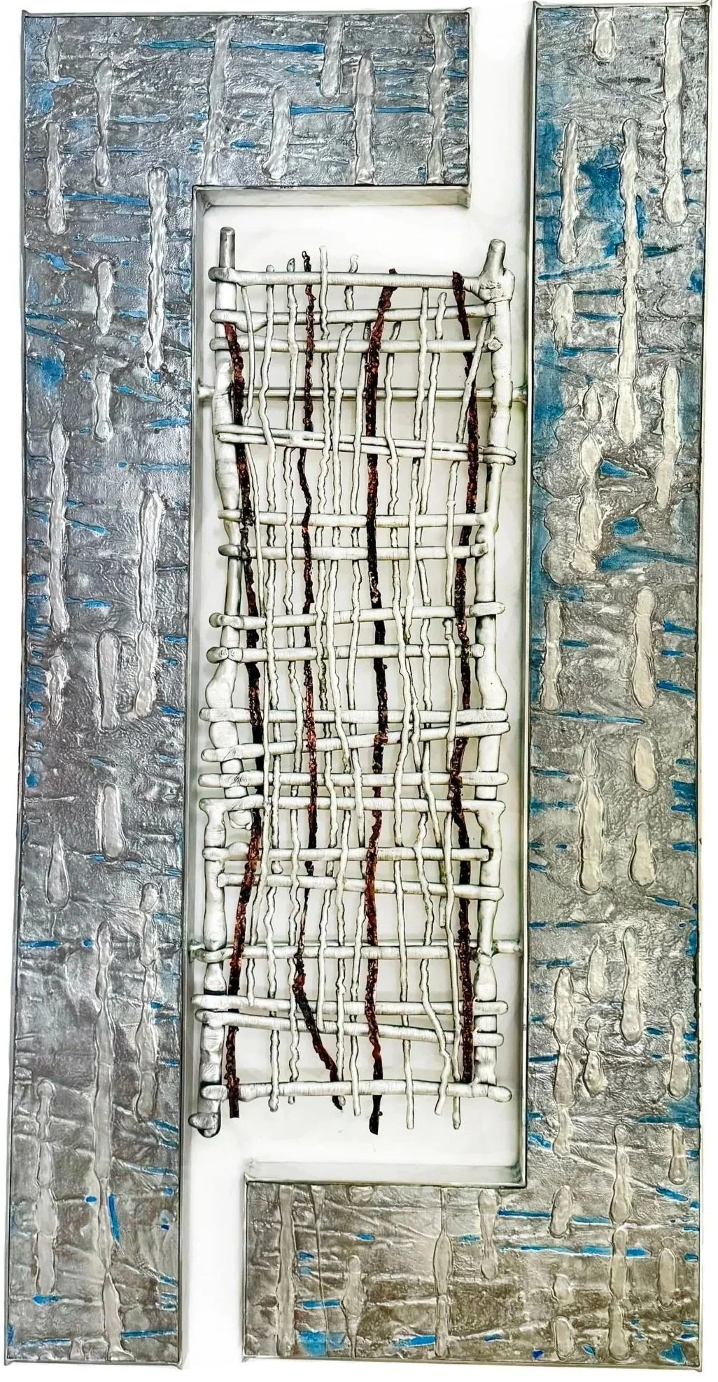 Materials: Acrylic and aluminum on canvas with an aluminum sculpture inset. Brushed aluminum frame. $5,500